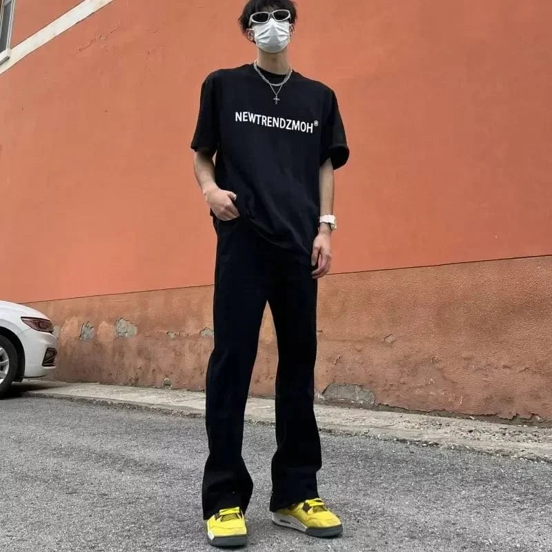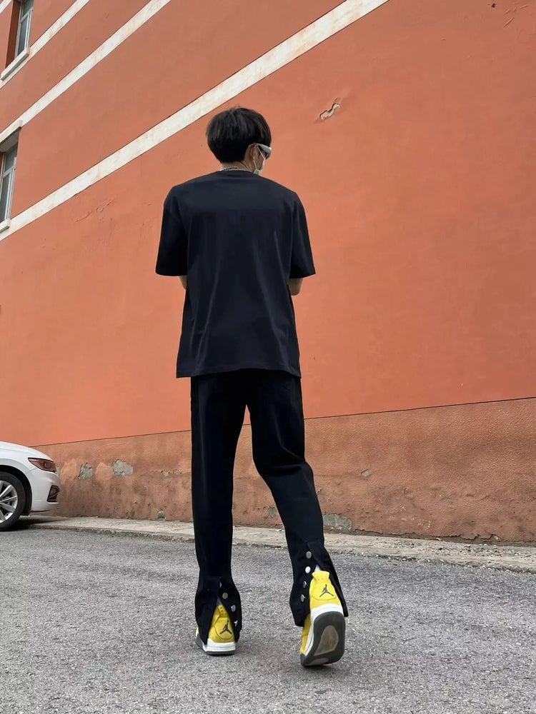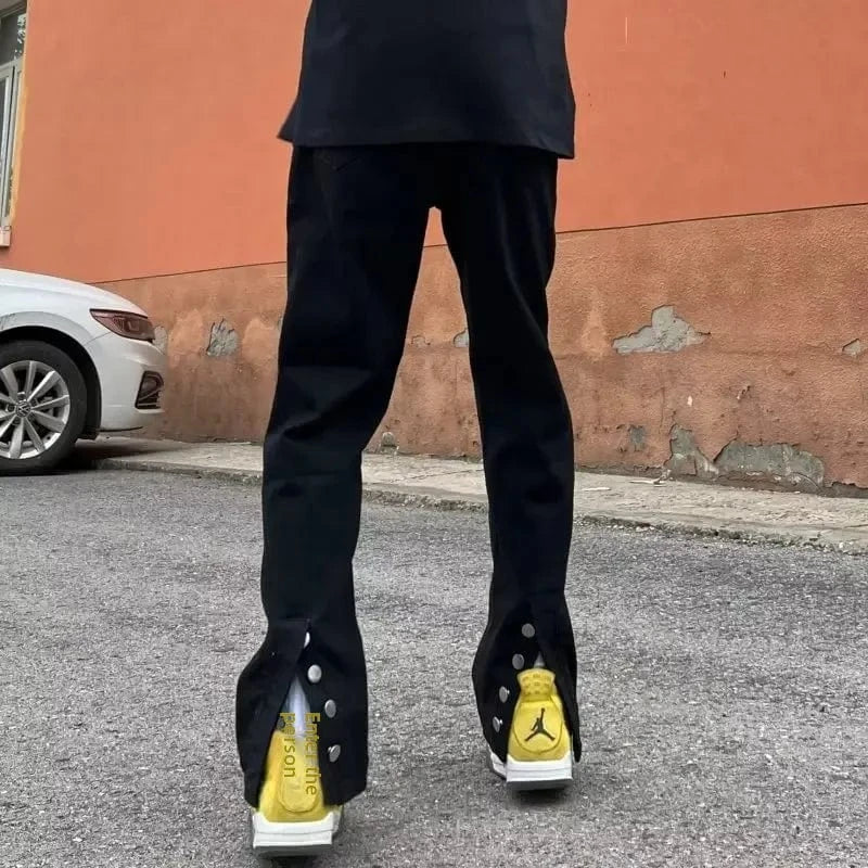 Jeans acampanats micro de nínxol de sensibilitat vintage d'estil americà amb botons negres i obertura lateral per a homes, disseny modern