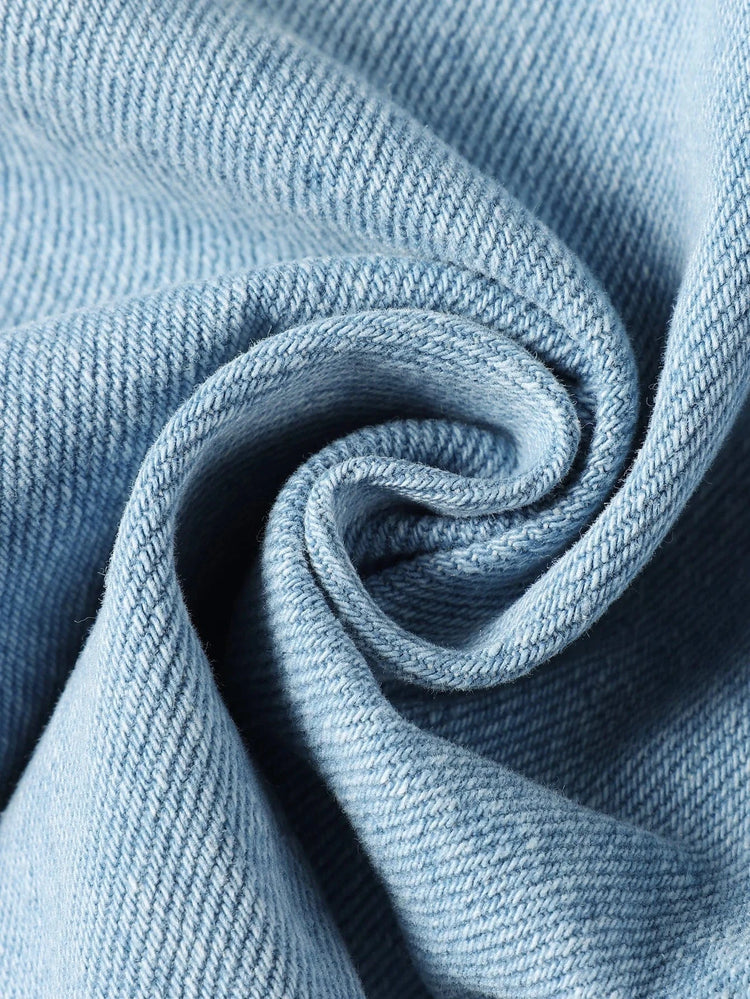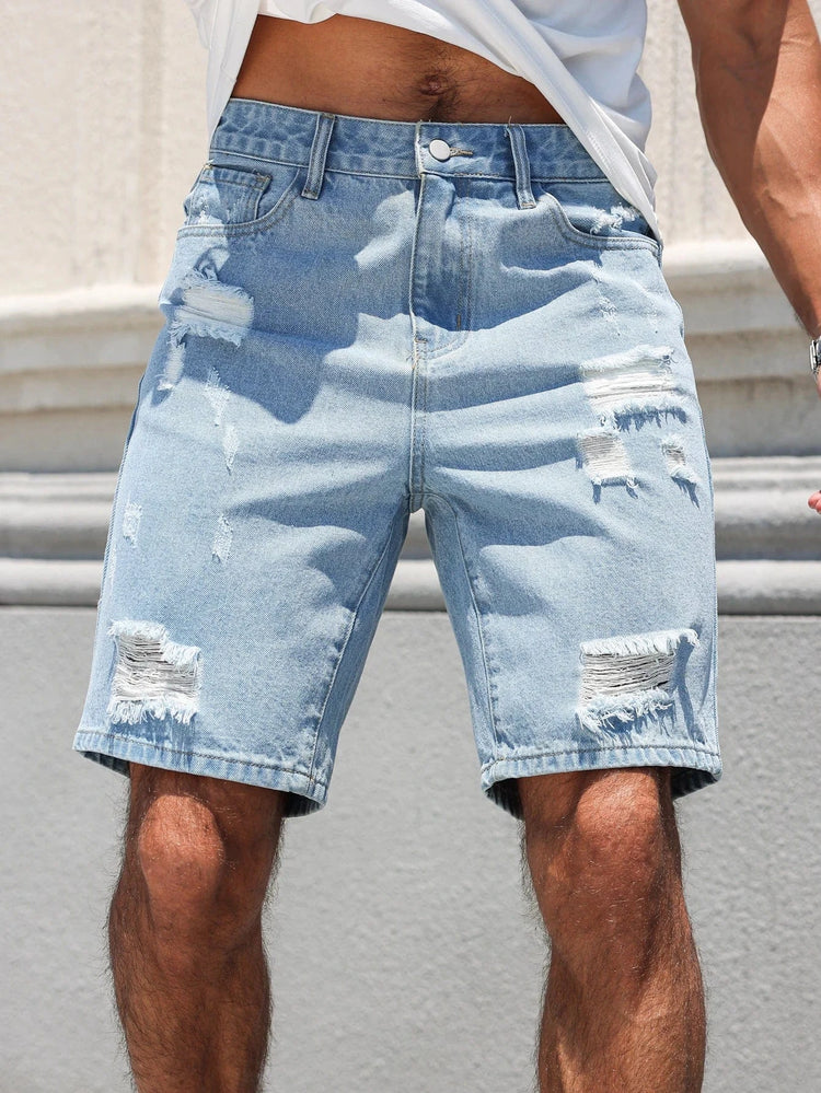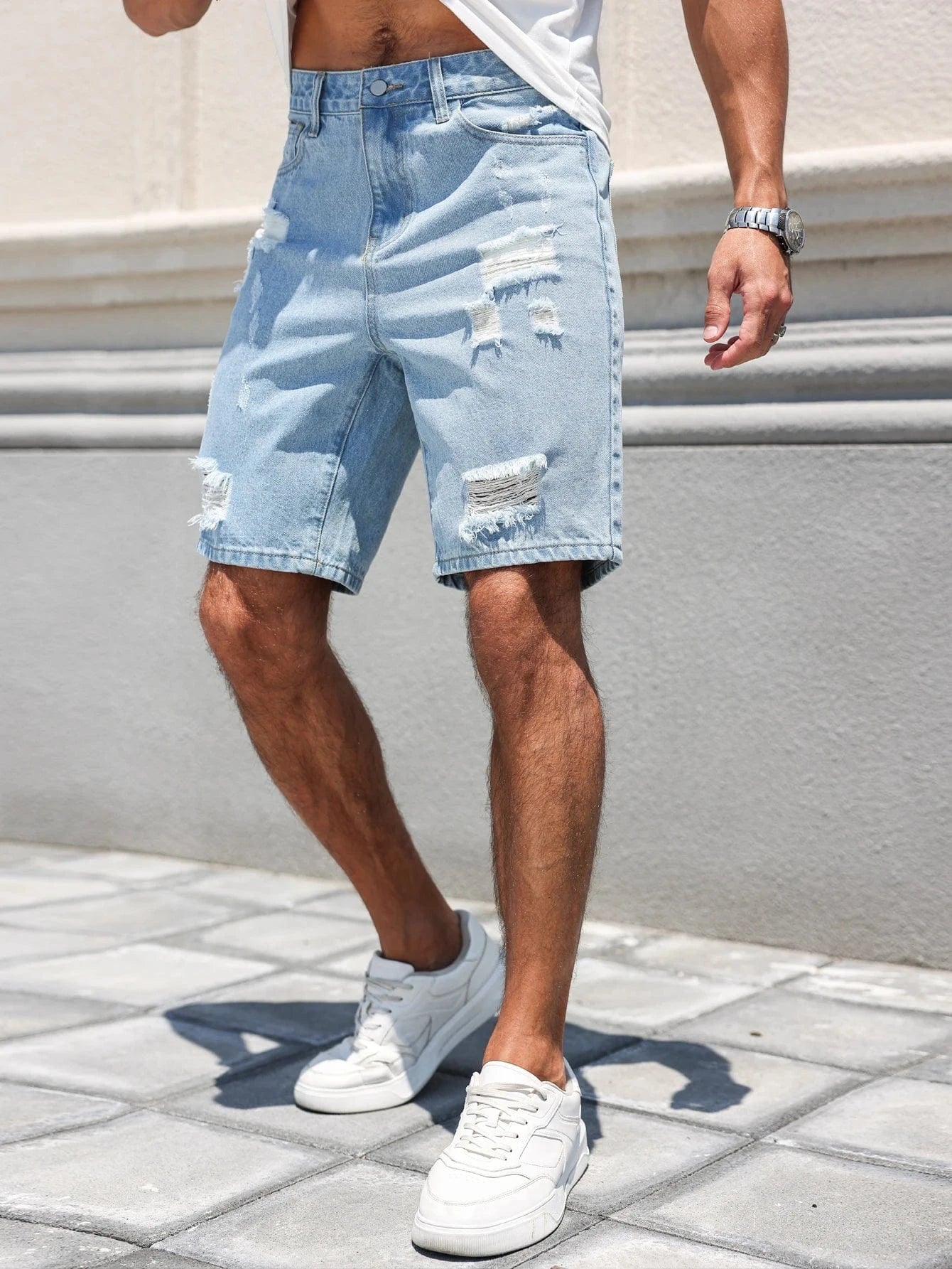 Fashionable denim shorts. Denim shorts originated in the 19th century and are a stylish item. Ripped denim shorts are a symbol of trends. The ripped elements add a sense of unruliness and personality, showing a casual and free style. The washed light blue tone is fresh and versatile, suitable for various occasions such as daily leisure and vacations. They can be paired with simple T - shirts and trendy sports shoes to easily create a fashionable look.