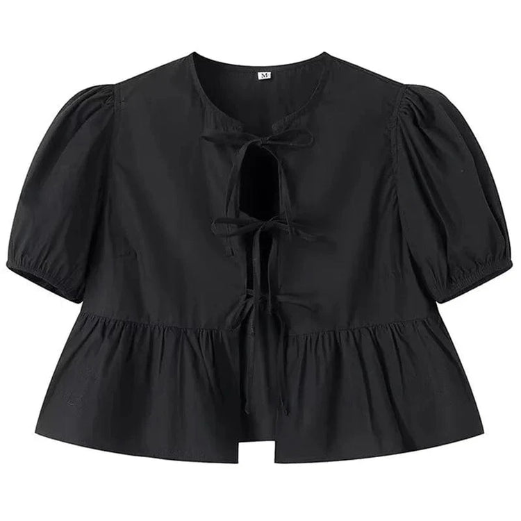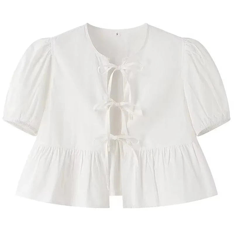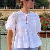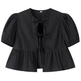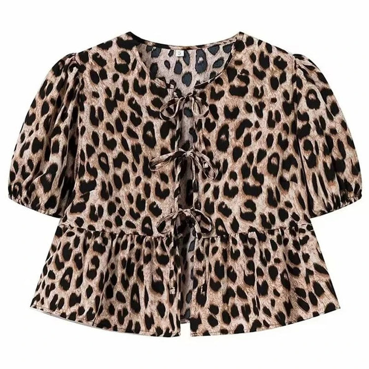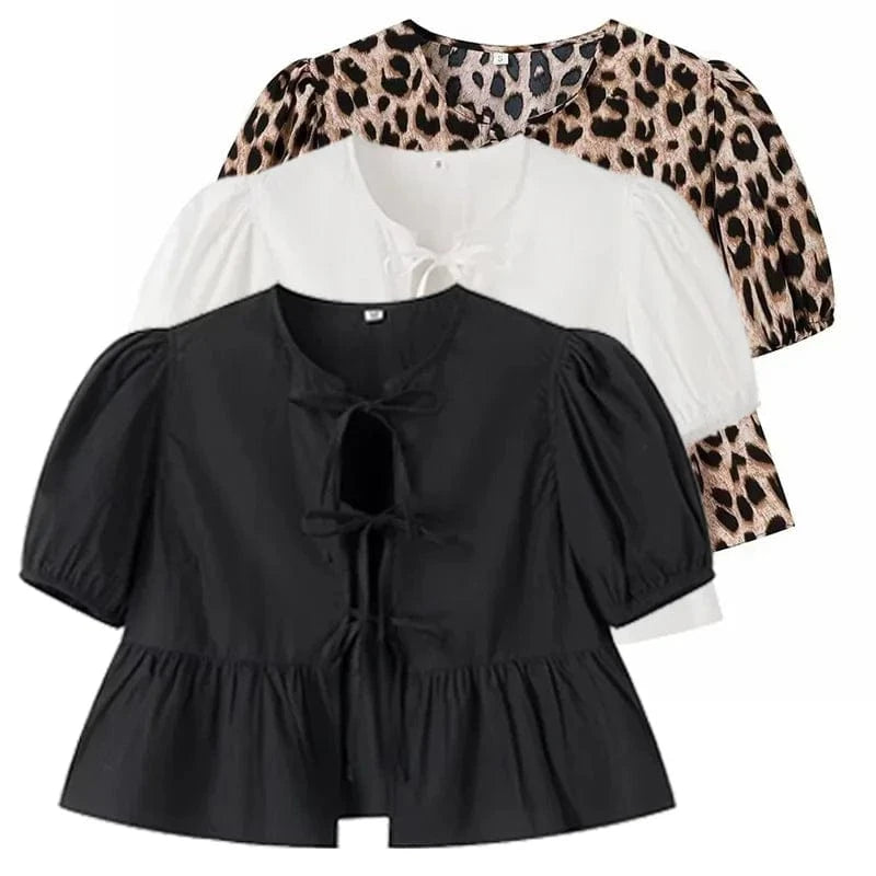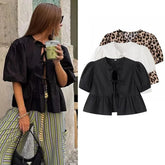 HXAO Women's Shirt Summer 2024 Shirts & Blouses White Black Leopard Shirt Frill Loose Fit Top Short Sleeve Crop Lace-Up Blouses