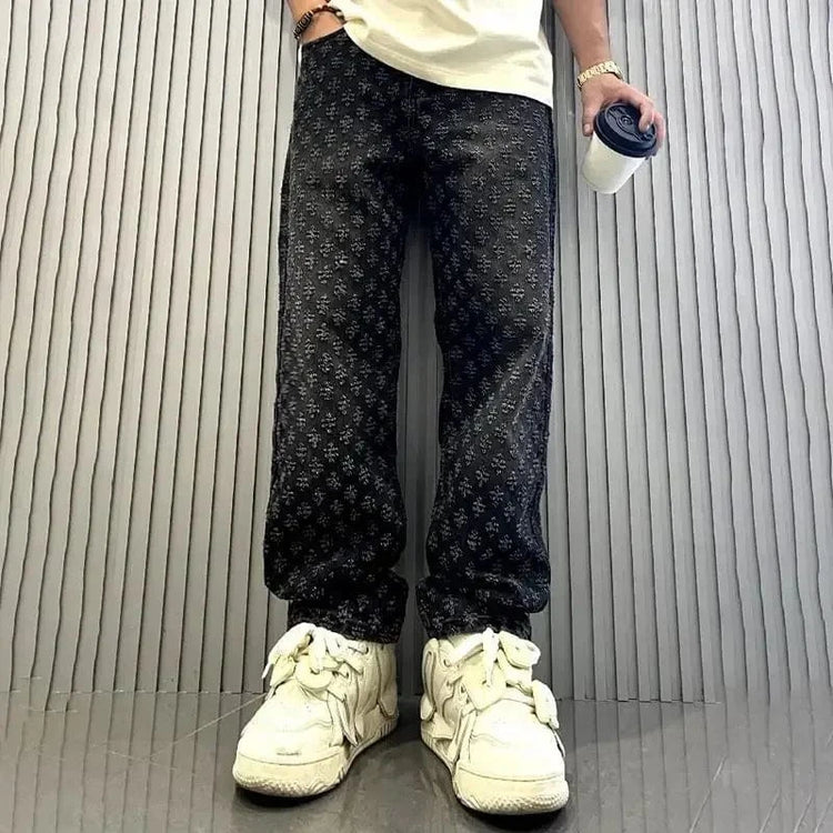 Korean Retro Long Pants High Street Ins Trendy Brand Jacquard Design Jeans Men's Street Y2K Loose Wide Leg Hip-hop Jeans